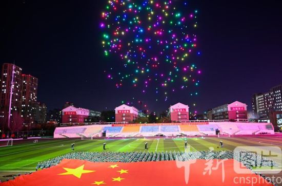 10月28日晚, 为庆祝沈阳航空航天大学建校70周年,沈阳航空航天大学举办“笃行七秩初心如磐”空地一体无人机表演大秀。图为无人机组成的多个图案点亮夜空。 中新社记者 于海洋 摄