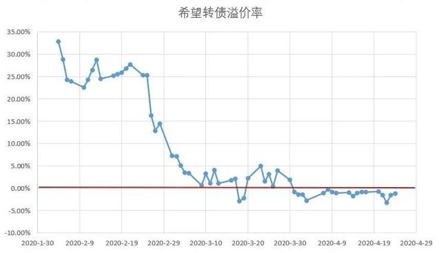 此外,同一转债的转股溢价率也会波动,以希望转债为例,它的溢价率就从30%降到了接近0。