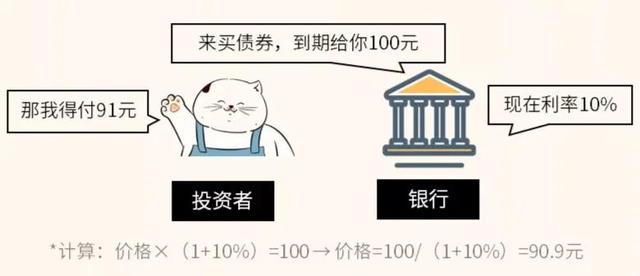 如果现在降息,利率下降到5%,到期还是拿100元,那么你买同一张债券的金额就会上升到95元。