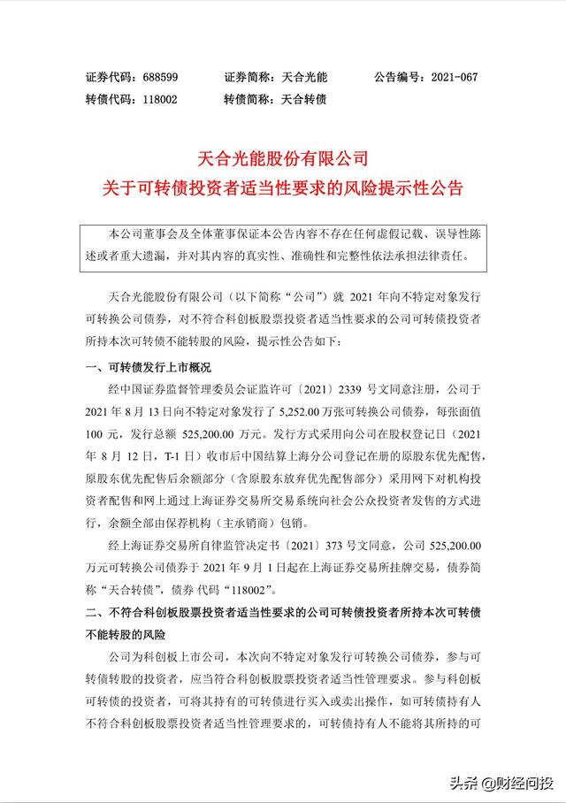 今天,科创板的天合光能发了个《关于可转债投资者适当性要求的风险提示性》公告。