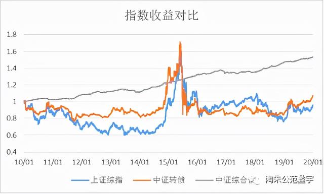 我们可以从下图看到,可转债的价格波动要远大于普通债券,而和上证综指的相关性非常大。不过,值得一提的是,可转债的波动要稍小于股票。绝大多数情况,在股票熊市的时候,转债更为抗跌,牛市的时候,转债跟涨,但是涨幅略小于股票。