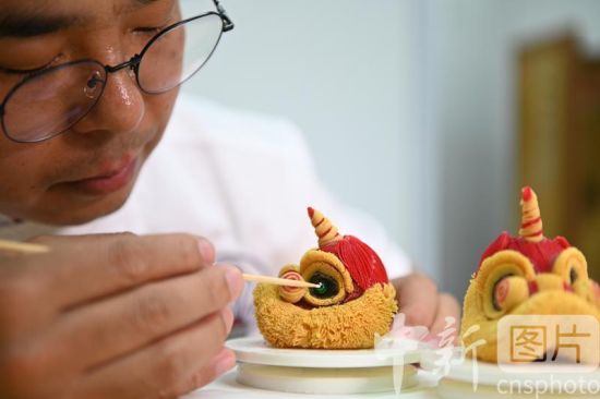 图为10月14日,辽宁沈阳,武杨给醒狮酥成品“点睛”。 中新社记者 于海洋 摄