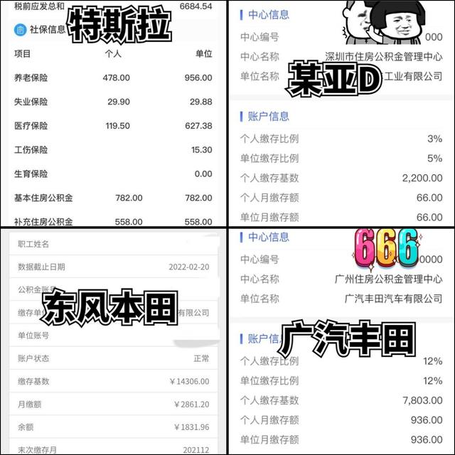 如果要给国内汽车公司的待遇排个名,那看他们的公积金缴纳基数、比例就知道了。其中最强的是特斯拉,不仅按照实际工资 足额缴纳公积金(企业10%、个人10%),而且还有补充公积金(8%左右)。第二梯队的就是合资企业了,如本田、丰田,一般也是按照实际工资 足额缴纳公积金(企业10%、个人10%),但是没有补充公积金。第三梯队就是国内厂商了,好一点的,按照实际工资缴纳公积金,差一点的,按照当地最低工资缴纳公积金。而且比例也不是按照企业和个人各10%来缴纳的,比如说:企业缴纳5%,个人3%的情况也是有可能的。
