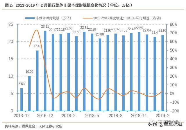 一、以固收为主体,积极布局权益类。2018年初以来,银行非保本理财规模就在22万亿附近波动。老产品在压降,就得有新产品在扩张。扩张的这部分,主要是“类货基”为代表的的固收类,并辅以权益类和混合类产品。