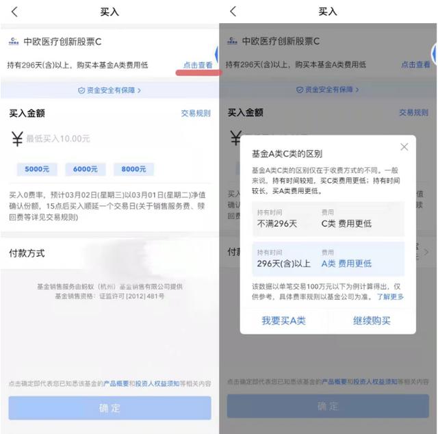 比如在购买C类基金时,会弹出有关A类基金与C类基金购买费用差异的明确提示。