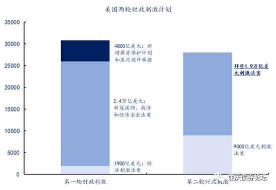 第二,财政刺激下的美国居民消费会对通胀火上浇油吗?昨日,美国众议院预算委员会批准了1.9万亿美元新冠援助议案,预计本周稍晚可付诸众议院全体表决通过。接下来将交之参议院投票,由于预算和解(Budget Reconciliation)程序的存在,基本上替民主党扫清了未来达成财政刺激计划的障碍,市场对方案落地情绪乐观。根据此前公布的方案内容,这份计划的三个重点包括:1)向低收入家庭和个人发放1400美元/人的一次性支票,使个人补贴金额从12月批准的600美元提高到2000美元;2)将失业救助金从300美元/周提高到400美元/周,并将救助金的期限从3月延长至9月底;3)向州和地方政府提供援助。这是继去年3.1万亿美元疫情救助计划之后的第二次广泛撒币,并将大量投放至居民家庭账户。在目前高度关注的通胀预期风险之下,加量的财政刺激是否会加重市场对于通胀预期实现的担忧?我们认为整体不必过度担忧,但需要关注服务性消费后续回补后对PCE的拉动作用。