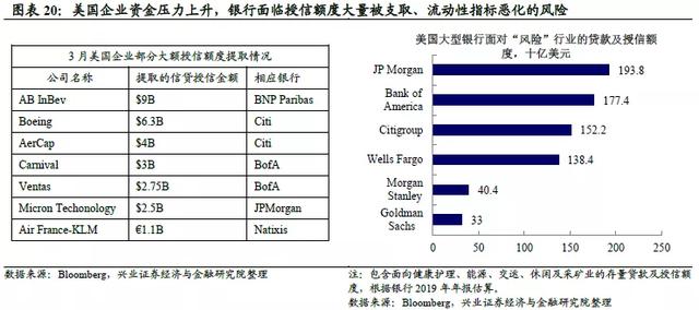冲击4:企业现金流枯竭,信贷需求激增,银行抛售信用债来“补窟窿”。此外,在疫情冲击下,美国企业生产经营活动受到负面影响,借贷需求快速上升。波音公司本月提取授信额度达63亿美元,且于3月13日正式宣布其已用掉约138亿美元贷款额度。银行授信额度大量被支取,银行流动性指标恶化,不得不卖出资产来满足这一需求,这导致大量信用债被抛售。企业信贷需求激增消耗银行资本,银行不得不抛售信用债,这使得信用债市场的流动性也进一步紧张。而考虑到3-4月仍有大量美国企业债要到期,信用债市场的流动性压力可能将进一步上升。