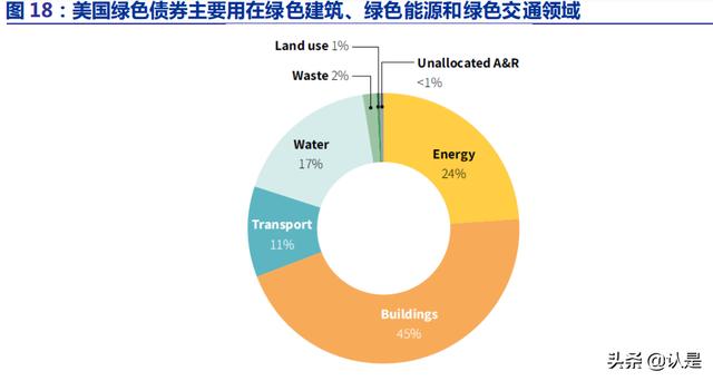 美国绿色债券筹集资金主要投资在建筑领域、绿色能源和绿色交通。自美国市场 成立以来,建筑一直是最主要的投资方向,2020 年其占比达到 45%,紧随其后的是 可再生能源(580 亿美元)和水资源(420 亿美元),分别占比 24%和 17%。可再生能源 项目一直在稳步增长,2014 年仅为 13 亿美元,2020 年达到 154 亿美元的峰值。 垃圾处理和土地利用方向分别占发行总量的 1.5%和 0.6%,这两项指标在 2020 年都 有所减少。信息通信技术和工业占份额最小,不到总发行量的 1%,这与我国有很大 的不同。