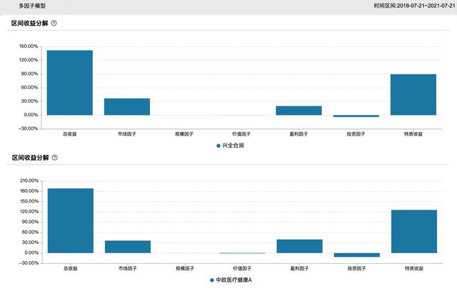 兴全合润近三年总收益率141.72%,多因子模型拆解后,其中市场因子占比36.66%,规模占比-0.03%,价值因子占比-0.21%,盈利因子占比19.89%,投资因子占比-4.14%,特质因子占比89.55%。中欧医疗健康A近三年总收益率188.27%,其中市场因子占比36.13%,规模占比-0.06%,价值因子占比-1.30%,盈利因子占比39.60%,投资因子占比-11.68%,特质因子占比125.59%。可见,兴全合润的收益主要来自于市场因子,同时少量盈利因子,而中欧医疗健康则盈利因子和市场因子并重。
