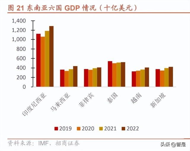 东南亚是当今世界经济发展最有潜力和活力的地区之一。东南亚共由 11 个国家组成:缅甸、泰国、柬埔寨、老挝、 越南、菲律宾、马来西亚、新加坡、文莱、印度尼西亚、东帝汶。其中,东南亚六国(印度尼西亚、马来西亚、新加 坡、泰国、越南、菲律宾)的经济体量较大。根据 IMF Outlook 预测,2022 年东南亚六国的人口将达到 5.9 亿人(中 国人口约 14.1 万亿人),占全世界人口的 7.4%;GDP 将达到 3.5 万亿美元(中国 GDP 将达到 19.9 万亿美元)。