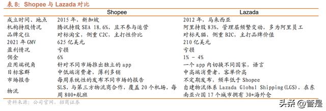 Shopee 最大的竞争对手为 Lazada,二者在管理层、品牌定位、目标客户、应用端、物流体系上都有很大不同。