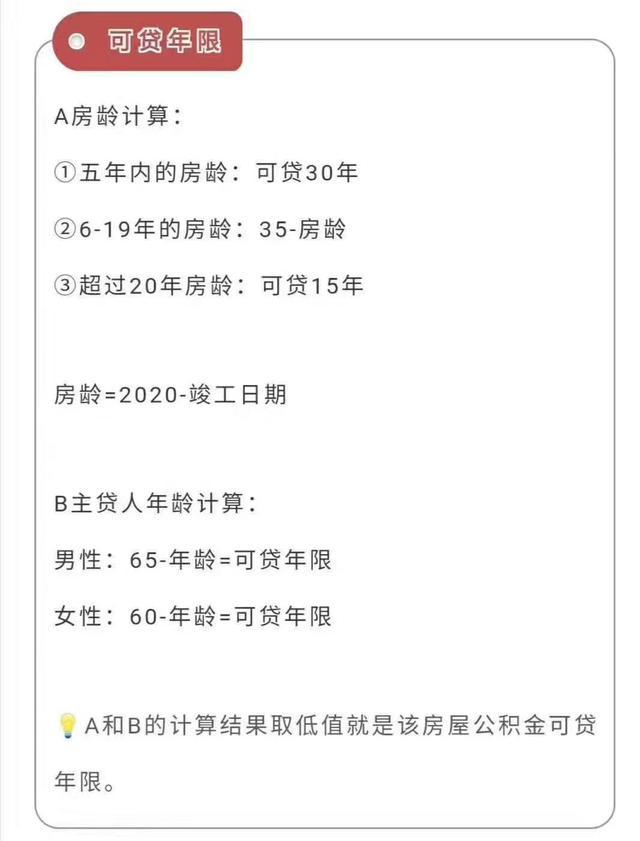 贷款年限,次新房可贷30年,房龄6-19年可贷年限=35-房龄,房龄20年以上可贷15年。男性最高贷到65岁,女性最高贷到60岁。