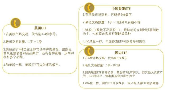 美股市场上的ETF是品种最多,最齐全的,而且可多可空,最低交易1股,港股和A股市场则需要至少一手起买;港股市场上的ETF需要注意的是,它的1手可能是1股到几百股不等,国内ETF一手是一百股。
