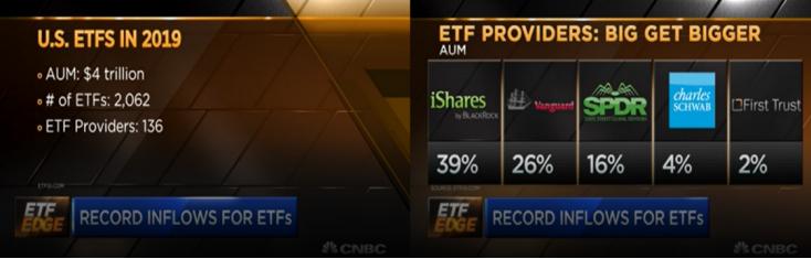 接下来看看美港股市场的ETF。截至2019年末,美国ETF的资产总规模达到了4万亿美元,占全球2/3左右,比对冲基金的规模还要多出2.5万亿。美国市场上有两千多只ETF,主要发行商品牌包括贝莱德的iShares,Vanguard,State Street Global的SPDR,嘉信理财和First Trust。