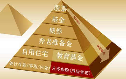 理财金字塔的原理是:最底层较宽较稳健,它是建立理财规划的基石,包括风险较小的理财产品,如储蓄、保险、国债等等;中层是年期、风险、回报都在中等水平,如企业债券、金融债券、优先股、各类基金等等;顶部较窄,投入资金不多,承担风险多,收益相对较高的具有进取性的投资产品,如房产、股票、期货等等。