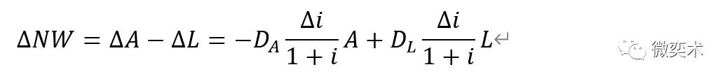 如果我们知道一家金融机构的金额加权平均资产期限、金额加权平均负债期限、适用于该机构现金流的原始贴现率,以及在我们所关注的这段时间内利率如何变化,我们就可以计算出该金融机构净值的市场价值变化。基本公式是: