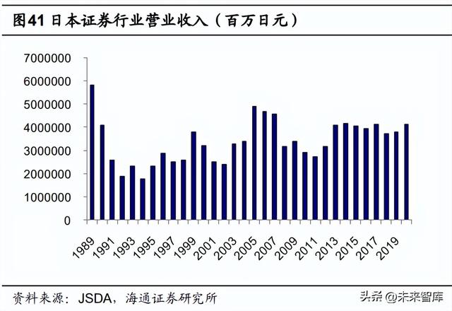 1993 年,日本允许信托、银行、证券 可以通过设立子公司的形式渗透到对方的业务领域,但出于经营稳健性考虑,各行业子 公司的业务范围受到一定的限制。1999 年 10 月撤销了对银行的证券子公司业务范围的 限制,日本正式进入混业经营。进入混业经营以来,日本证券行业营业收入基本保持持 平状态,以 32000 亿日元为中枢波动。2002 年网络券商出现后,通过提供较低的佣金 率,迅速在个人投资端抢占市场份额,但同时日本整个证券行业佣金率快速下滑。佣金率 的下滑使得日本证券行业经纪业务占比下滑,从 1989 年的 54%下滑至 2020 年的 16%。