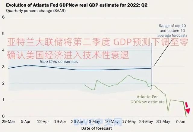 紧接着,亚特兰大联储的GDPNow追踪器将美国第二季度的经济增长率从1.3%下调至0%,且是近二周内第三次下调,而今年第一季度,美国GDP增长率已经为负1.5,经济衰退被定义为连续两个季度的GDP出现负增长。