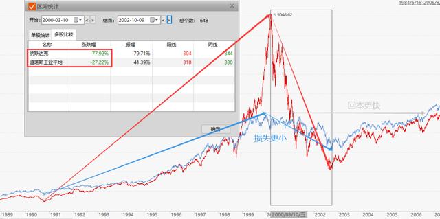 这两个都是美股指数,蓝线的道指涨幅空间更小,后期的跌幅也小,回本时间更快,红线的纳指涨幅巨大,伤害也更大,是前者的3倍左右,这个在A股上也曾上演过,比如2015年创业板VS沪深300等。