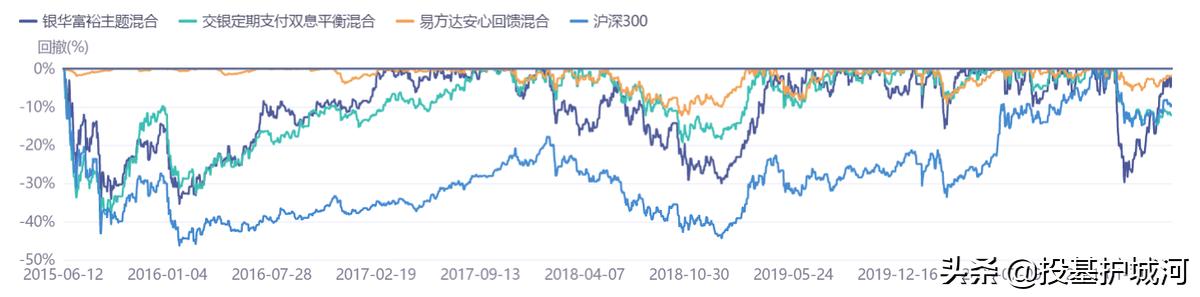 图表. 各重点类型基金回撤 银华富裕主题(偏股)&交银定期支付双息(股债平衡)&易方达安心回馈(偏债)