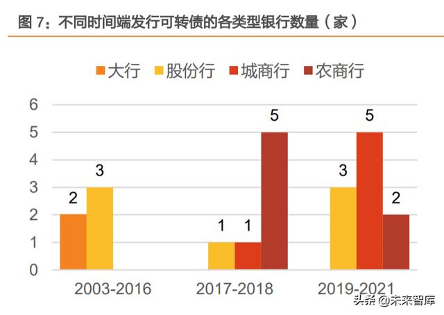 虽然银行上市后可以发行可转债,但是在 2016 年以前市场上只 有 16 家上市银行,且多为大行、股份行和规模较大的城商行,直到 2016 年之后银行登陆 A 股市场的节奏才有所加快。从 2016 年到现在,有 10 家农商行、13 家城商行上市,银行 业通过可转债补充资本的主体由以往的大中型银行转变为中小型银行。最为关键的是,银 行增发和配股面临着“1 倍 PB”的隐形要求。而银行发行可转债对主体资质并没有硬性的 约束,资质较低(低于 1 倍 PB)的区域银行更倾向于选择发行可转债来补充资本。(报告来源:未来智库)
