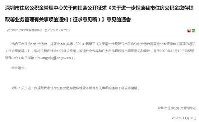 中国网地产讯 11月30日,深圳市公积金中心对外发布《关于进一步规范我市住房公积金缴存提取等业务管理有关事项的通知(征求意见稿)》公开征求社会各界意见。