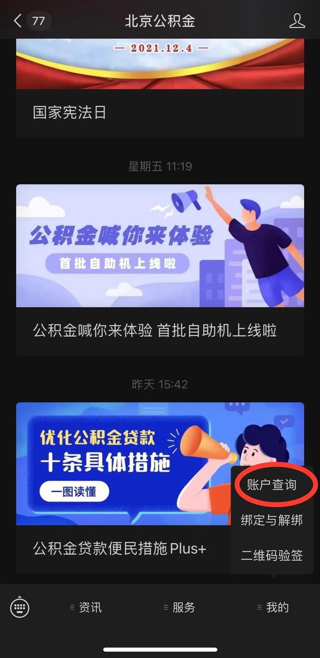 2. 在公众号的主界面的下面功能栏点击,"我的",在弹出的选项里面选择“账号查询”