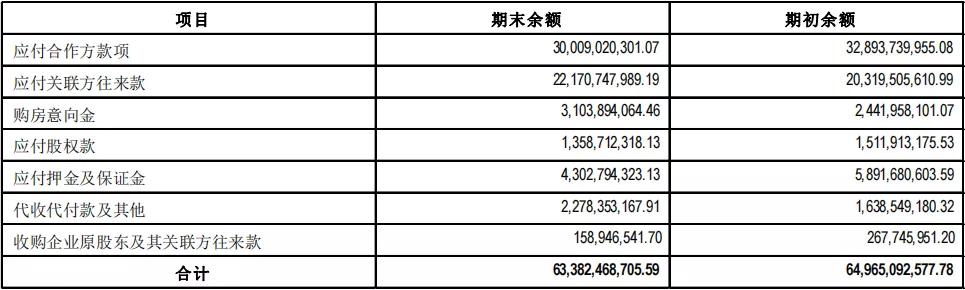 中报显示,应付款主要有合作方款项、关联方往来款,购房意向金、应付押金及保证金等,其中有500多亿都是往来款。