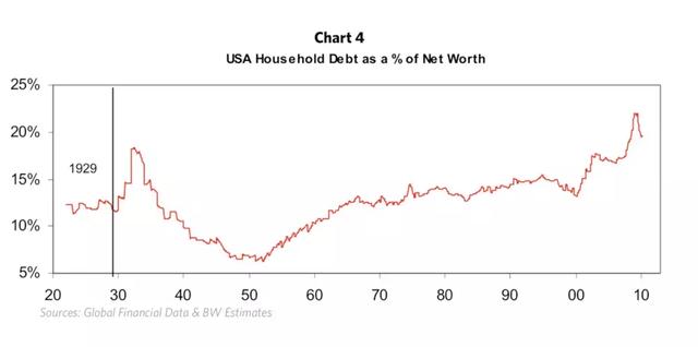 在经济和信贷低迷的情况下,债务负担在债务减少的同时也在增加,从而加强了债务清算的进程。图中还显示了家庭部门的债务相对于其净资产的比例,由于房价和股价下跌导致净值下降,杠杆率从已经很高的水平飙升,就像大萧条时期那样。