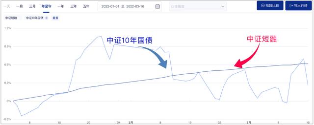 相较于国债,短期融资券今年以来的收益表现反而更为稳定。目前市场上有只中证短融指数,是由银行间市场的剩余期限1个月以上的短期融资券构成的。中证指数官网数据显示,截至2022年3月15日,中证短融指数今年以来收益率0.68%,而同期中证10年国债收益率仅为0.16%,并且前者的收益率走势不像后者般“上蹿下跳”。