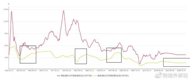伴随实际GDP增速下降 美国经济面临通缩的概率更大美国70年代名义潜在GDP,即考虑通货膨胀因素,则是大幅高于实际GDP,就是通货膨胀导致的。那时候的时代背景是,美联储在60年代末为了应对越战,采取宽松政策,美国政府军费支出大增,财政赤字大增,最终破坏了金汇兑本位制,美元兑黄金贬值。而在用石油以美元结算后,石油价格又因为欧佩克减产造成冲击,因石油这种重要的能源供给减少的原因,输入了通货膨胀。任何一种工业生产都需要物流,开车也需要油,油价上涨会带动价格上涨。那时候美国依赖能源,油价因人为供给减少造成的上涨,会脱离经济基本面,造成输入性的供给收缩导致的通货膨胀。