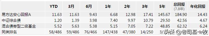 这是一只中长期纯债基金,成立于2014年4月,总回报率高达147.19%,年化回报为19.91%,在所有同类基金中高居第一!另外,海富通一年定期开放债券A成立于2013年10月,成立5年多来,总回报达到91.42%,年化回报超过了10%,达到12.74%,也相当给力。